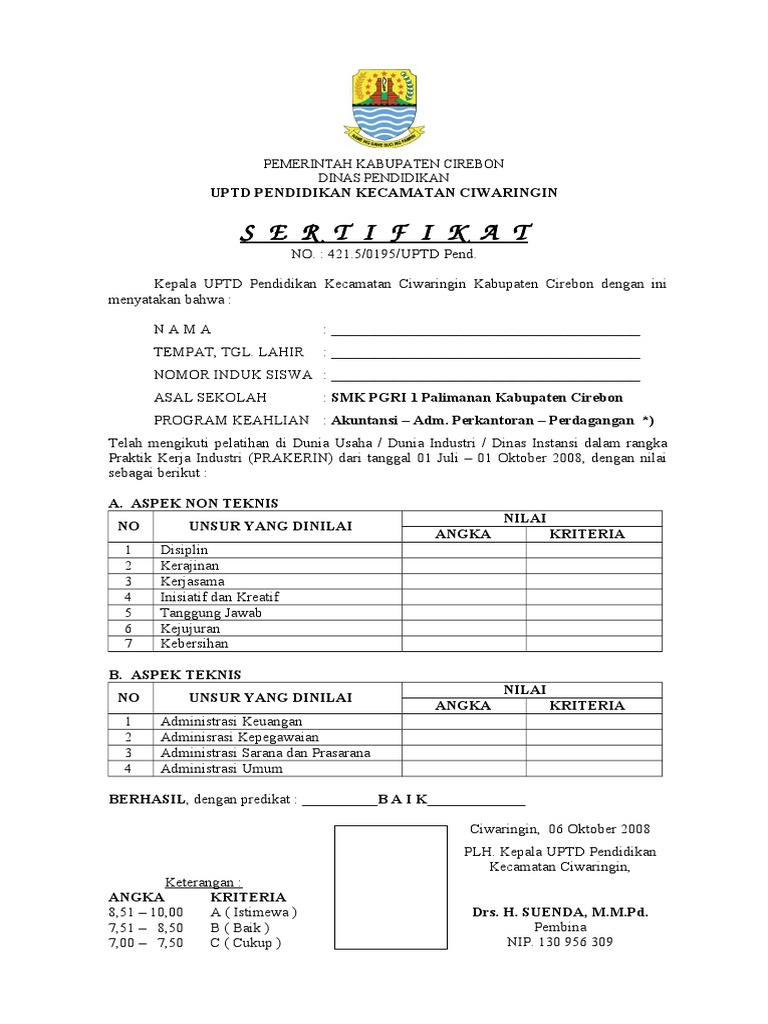 Pedoman laporan pkl terbaru psg smk plus pgri 1 cibinong. Sehingga dapat disimpulkan sertifikat adalah surat keterangan atau pernyataan secara tertulis dan tercetak sebagai tanda bahwa seseorang menguasai kompetensi tertentu di tempat melaksanakan suatu praktek kerja industri prakerin atau magang kerja atau praktek kerja lapangan pkl. Evaluasi di akhir program berupa uji kompetensi keahlian (ukk) akuntansi. Siswa kelas 2 akuntansi smk dengan jumlah minimal 25 orang per rombongan. Laporan praktek kerja industri smk muhammadiyah 3 tangerang selatan bidang keuangan akuntansi. Siswa kelas 2 akuntansi smk dengan jumlah minimal 25 orang per rombongan. Kompetensi dasar sudah tuntas sudah menyelesaikan administrasi sekolah sebelum melaksanakan prakerin biaya prakerin sharing antara orang tua siswa dan sekolah memenuhi pemberkasan prakerin antara lain: Memberikan penghargaan atas prestasi dan partisipasi pada kegiatan praktek kerja dalam rangka praktek kerja industri kepada : Tenaga adminstrasi keuangan di berbagai perusahaan. Mendata sertifikat nilai prakerin siswa dan menjilid semua fc sertifikat peserta prakerin perkompetensi keahlian. Alumni smea / smk yaspika; Pedoman laporan pkl terbaru psg smk plus pgri 1 cibinong. 25 nov 2013 template sertifikat.